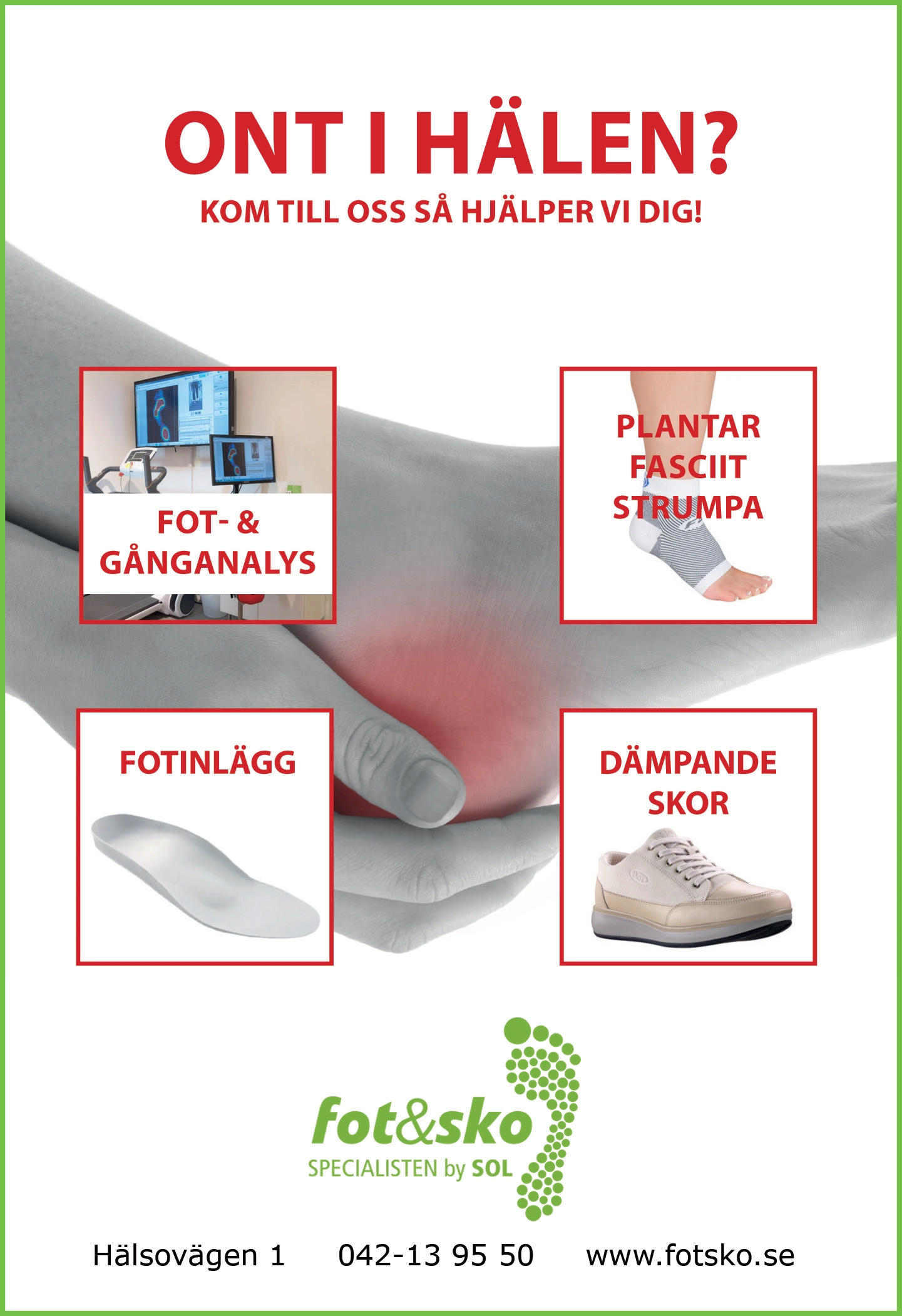 Går du runt och har ont i hälen? Vänta inte tills smärtan blir kronisk. Boka en tid hos oss i Helsingborg eller Landskrona så hjälper vi dig tillbaka till ett steg utan smärta.